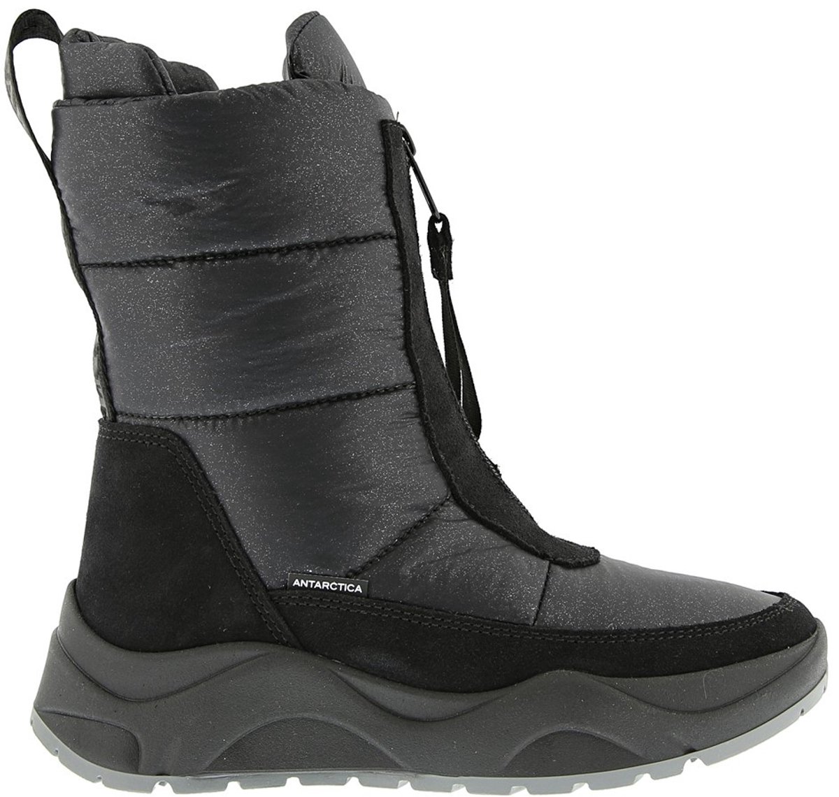 Antarctica AN 8758 zwart snowboots dames De Antarctica 8758 is een hoge snowboot voor dames met rits aan de voorkant. De snowboot heeft een suede upper met polyester en een hoge rubberen zool, de voering is van synthetisch wol. De snowboot heeft een ritssluiting en aantreklus voor makkelijke in- en uitstap. Kleur: zwartMateriaal bovenwerk: nylon, suéde