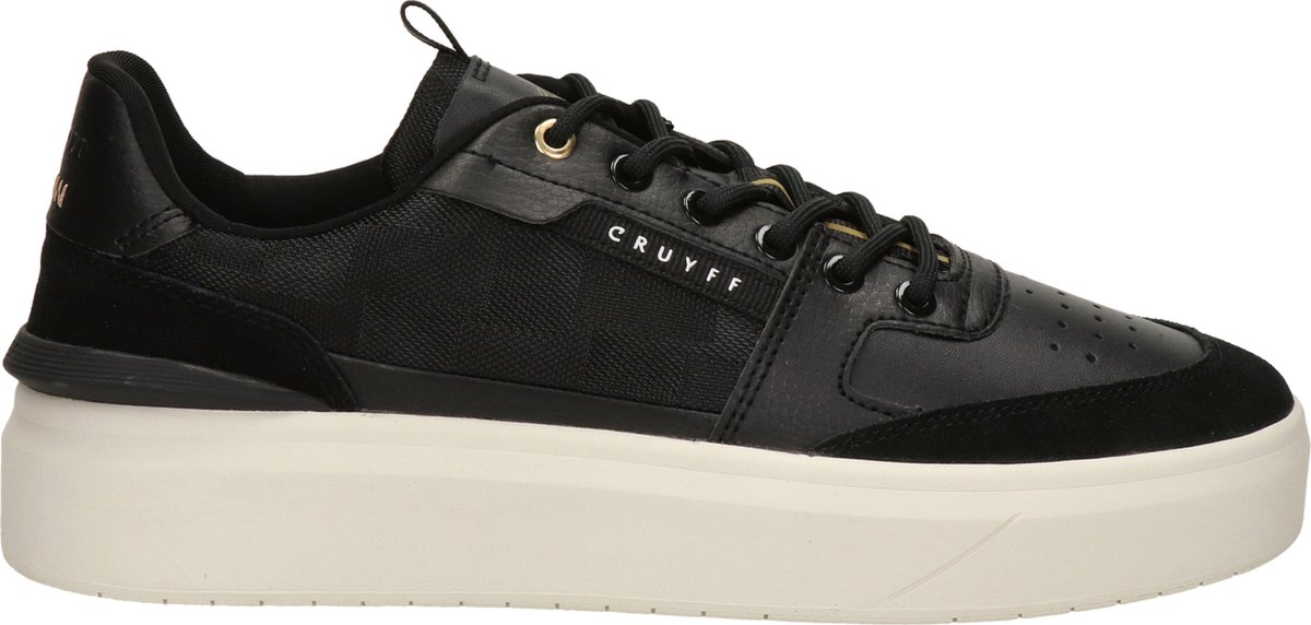 Dit is de vernieuwde Endorsed Tennis, een lage sneaker met een opvallend uiterlijk van het merk Cruyff. Het bovenwerk is uitgevoerd in zwart leer met een tong en zijkant van geweven textiel en heeft panelen van zwart suède. Extra leuk is de bekende,goudkleurige Cruyff branding. Zo is de tong gesierd met een merkopdruk en aantreklus met tape. Andere opvallende details zijn de perforaties op de neus, het merkreliëf aan de zijkant, de zwarte hielstabilisator en het merkreliëf en stiksel op de hiel. De zachte voering van neopreen textiel in combinatie met de opgevulde enkelkraag en het uitneembare voetbed zorgen voor een optimaal comfort. De rubberen zool heeft een gripvast profiel waarmee je veel grip en een hoog loopcomfort ervaart. Een heerlijke sneaker voor ieder avontuur!