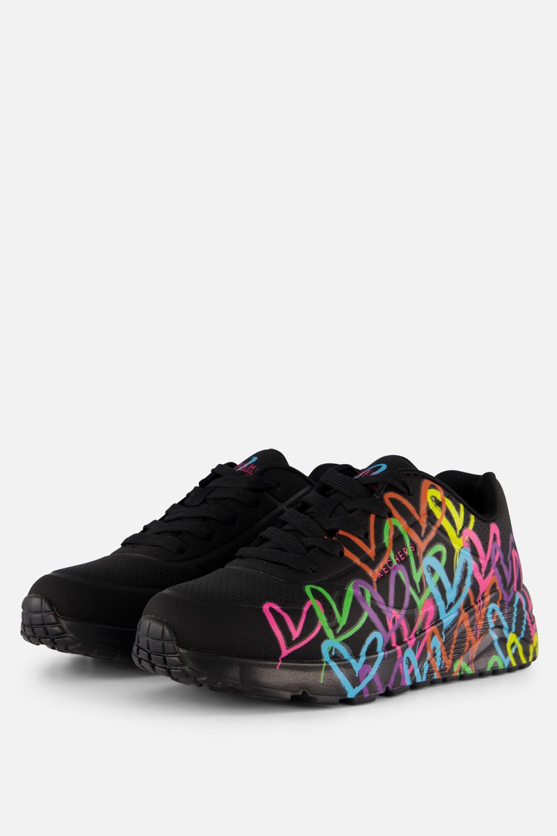 Deze Skechers X JGoldcrown Uno Lite Spread The Love sneakers hebben het kenmerkende hartontwerp van kunstenaar James Goldcrown op het bovenwerk. De sneakers zijn synthetisch, de voering en comfortabele binnenzool zijn van textiel. De sneakers zijn voorzien van een air-cooled memory foam voetbed en een vetersluiting.