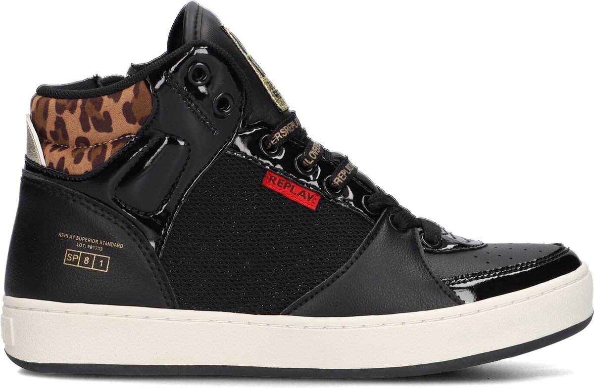 Met deze eyecatcher aan je voeten val je zeker op! En daarnaast zit deze hoge sneaker COBRA van het merk REPLAY ook nog eens heerlijk. Dit model is gebaseerd op traditionele hoge basketbalschoenen en voorziet jouw outfit van een sportieve look. Het bovenwerk is uitgevoerd in zwart textiel met glitters en zwarte panelen van lederlook en lakleatherlook. De extra hoge tong is voorzien van een merklabel, op de hiel zit een goudkleurige aantreklus, de neus heeft perforaties, bij de veterklep zit een rood merkembleem en de gewatteerde enkelkraag heeft eeen panterprint. De witte, rubberen kuipzool heeft een fijn profiel met een goede grip en daarnaast trek je de sneaker gemakkelijk aan met de ritssluiting aan de zijkant. Naast de zwarte veters wordt er ook paar veters met merkopdrukken geleverd, zo kun je afwisselen! De voering is gemaakt van ademend mesh en de sneaker heeft een vast voetbed van dempend memory foam voor extra comfort.