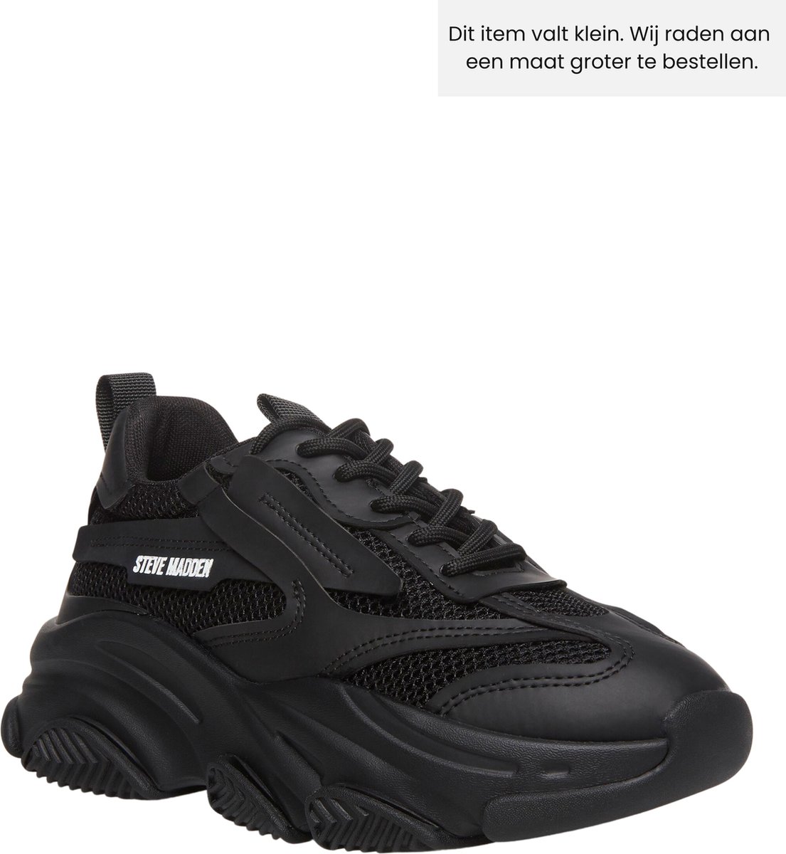 Creatief en speels: dat zijn de sneakers van de Amerikaanse ontwerper Steve Madden. Zo ook dit gave model POSSESSION! Dit model is uitgevoerd in zwart mesh met leatherlook overlays ook in de kleur zwart. Leuke details zijn de dubbele stiksels, de merkopdruk op de zijkant, de merkstud op de hiel, de veters en het merkembleem op de veters. Het binnenwerk is gemaakt van mesh en heeft een uitneembaar voetbed met fijne demping. De tong en enkelkraag zijn opgevuld voor extra comfort en op de tong en hiel vind je handige aantreklusjes. Door de beige hielstabilisator ervaar je extra steun bij de hiel en het grove profiel van de loopzool creëert veel grip bij iedere stap. De zool zorgt niet alleen voor comfort, maar ziet er ook superleuk uit door de inzetstukken, details en golvende vormen. Een sneaker om verliefd op te worden! Heb jij al een crush?