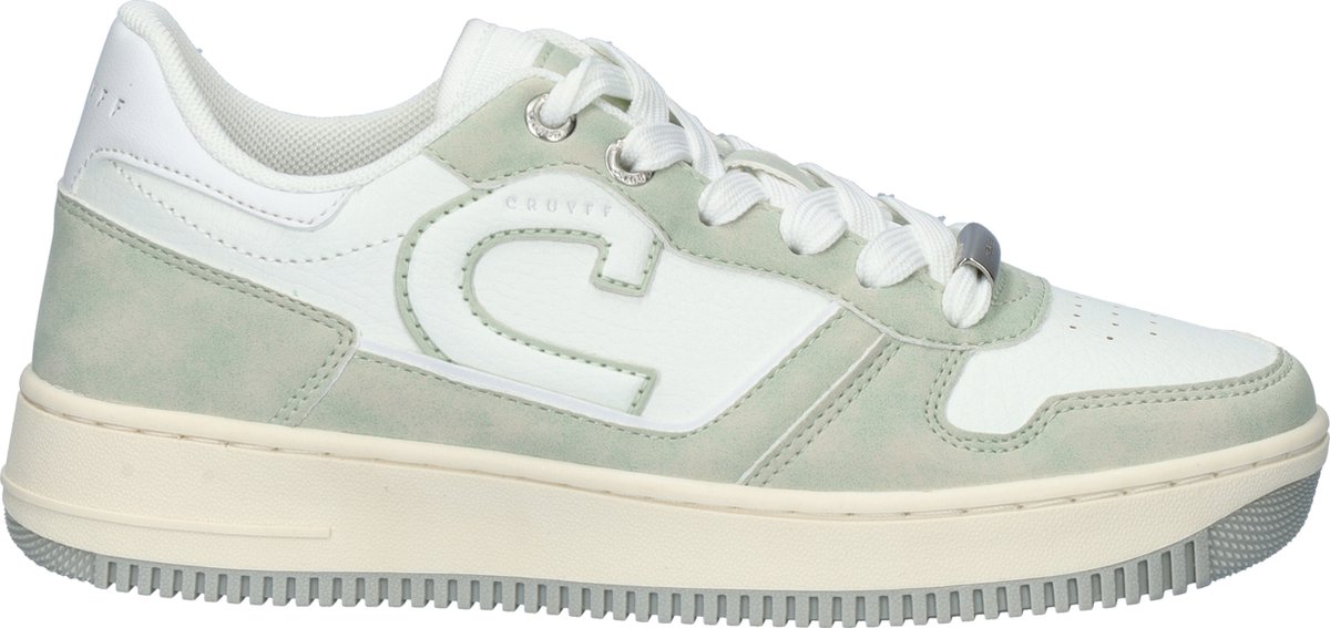 Een nieuwe, frisse update binnen de Cruyff collectie. Dit zwarte model CAMP LOW LUX is uitgevoerd in wit leahterlook met overlays in een mintachtige kleur. Het sportieve karakter wordt bepaald door de retro look zool en de witkleurige beroemde C-flash op de zijkant. De tong is voorzien van een merklabel en de leatherlook hielcap heeft een zilverleurig merkreliëf. De voering is van textiel en het voetbed is uitneembaar. Extra tof is het veterplaatje, de metalen veterringen en het merklabel op de tong. De beige, rubberen zool heeft een zoolrand met diepe groeven wat zorgt voor een nog stoerdere uitstraling. Combineer 'm bij talloze outfits!