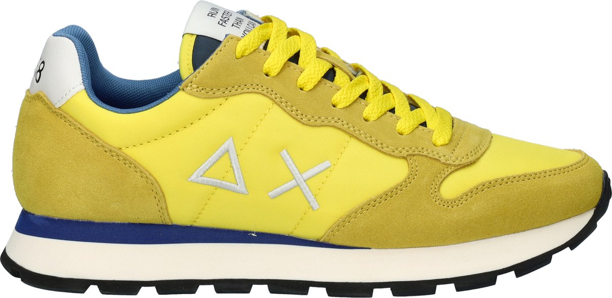 SUN68 is een Italiaans modemerk met casual designs van de beste materialen om iedere dag te dragen. Er is veel aandacht voor originele details en onderzoek in goede materialen. Dit gele model TOM SOLID NYLON MEN met blauwe accenten is uitgevoerd in stevig textiel en heeft een afwerking van suède panelen. Op de tong bevindt zich een textiel label met de quote RUN FASTER THAN YOU CAN en de hiel heeft een witte leren hielkap met blauwe opdruk. De witte geborduurde merkopdruk op de zijkant en de blauwe accentstreep in de zoolrand maken 'm extra opvallend. Deze lichtgewicht sneaker is gevoerd met geel ademend mesh in combinatie met zacht textiel en heeft een uitneembaar voetbed met comfortabele demping. Door de gewatteerde enkelkraag en tong ervaar je veel steun en comfort en de witte oplopende zool met zwarte loopzool heeft dankzij de vierkante noppen een optimale grip. Wissel je look af met de witte en gele veters voor een perfecte match bij je outfit!