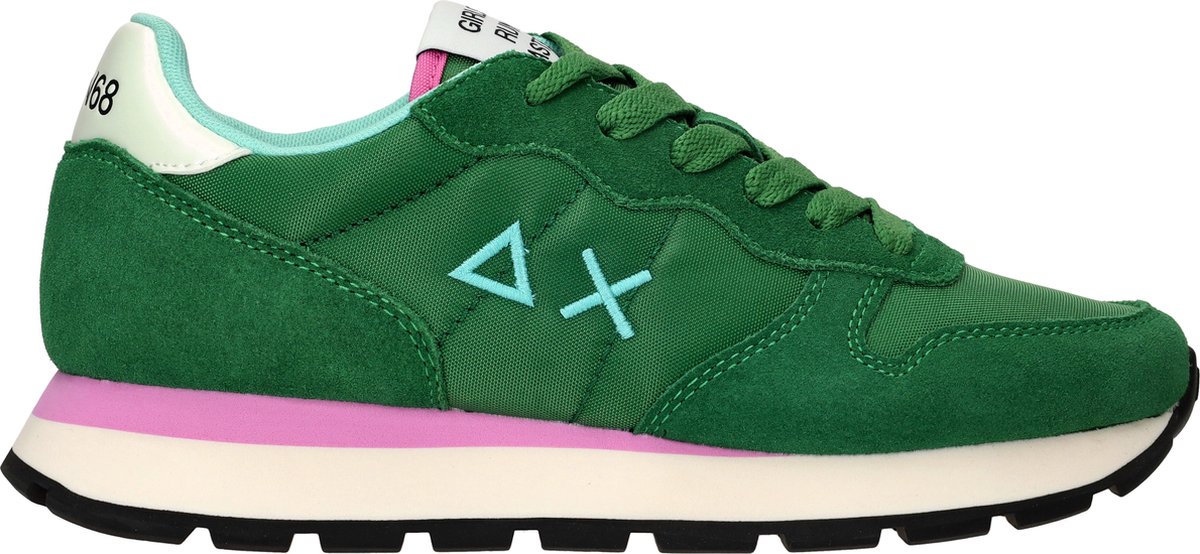 SUN68 is een Italiaans modemerk met casual designs van de beste materialen om iedere dag te dragen. Er is veel aandacht voor originele details en onderzoek in goede materialen. Dit opvallende groene model ALLY SOLID NYLON met groene en roze accenten is uitgevoerd in stevig textiel en heeft een afwerking van suède panelen. Op de tong bevindt zich een wit textiel label met zwarte merkopdruk en de hiel heeft een witte hielkap met zwarte merkopdruk. Deze lichtgewicht sneaker is gevoerd met mint ademend mesh in combinatie met zacht textiel en heeft een uitneembaar voetbed met comfortabele demping. Door de gewatteerde enkelkraag en tong ervaar je veel steun en comfort en de wit met roze oplopende zool met zwarte loopzool heeft dankzij de vierkante noppen een optimale grip. Leuk is dat deze sneaker met twee veters wordt geleverd. Een groene veter, maar ook een roze veter. Super leuk om eens te wisselen.