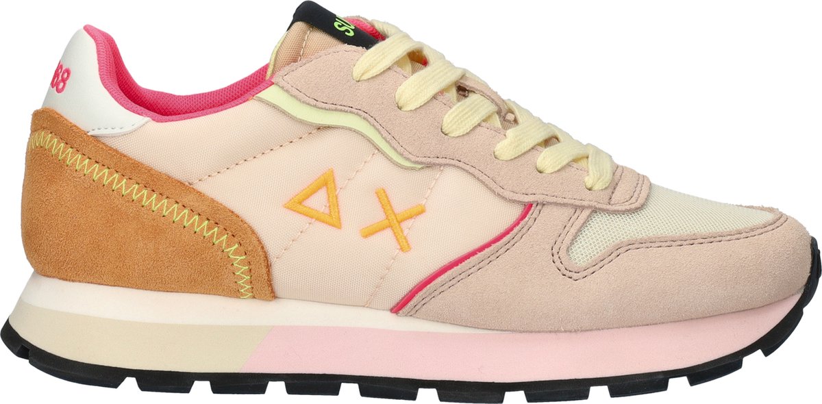 Stap in de wereld van kleur met de SUN68 ALLY COLOR EXPLOSION lage sneakers voor dames. Deze lichtroze sneakers zijn een perfecte toevoeging aan jouw casual outfits. Het bovenwerk bestaat uit lichtroze textiel en suède op de zijkant, heeft glittermesh op de voorvoet en is verder afgewerkt met oranje en roze suède overlays. Opvallend zijn de neon roze, oranje en groene accenten. Het oranje, geborduurde kruisje en driehoekje hoort helemaal bij dit model! De zwarte loopzool biedt voldoende grip en je kunt de gele veters ook vervangen voor multikleurige veters. Met de sneakers ben je altijd stijlvol en comfortabel onderweg.