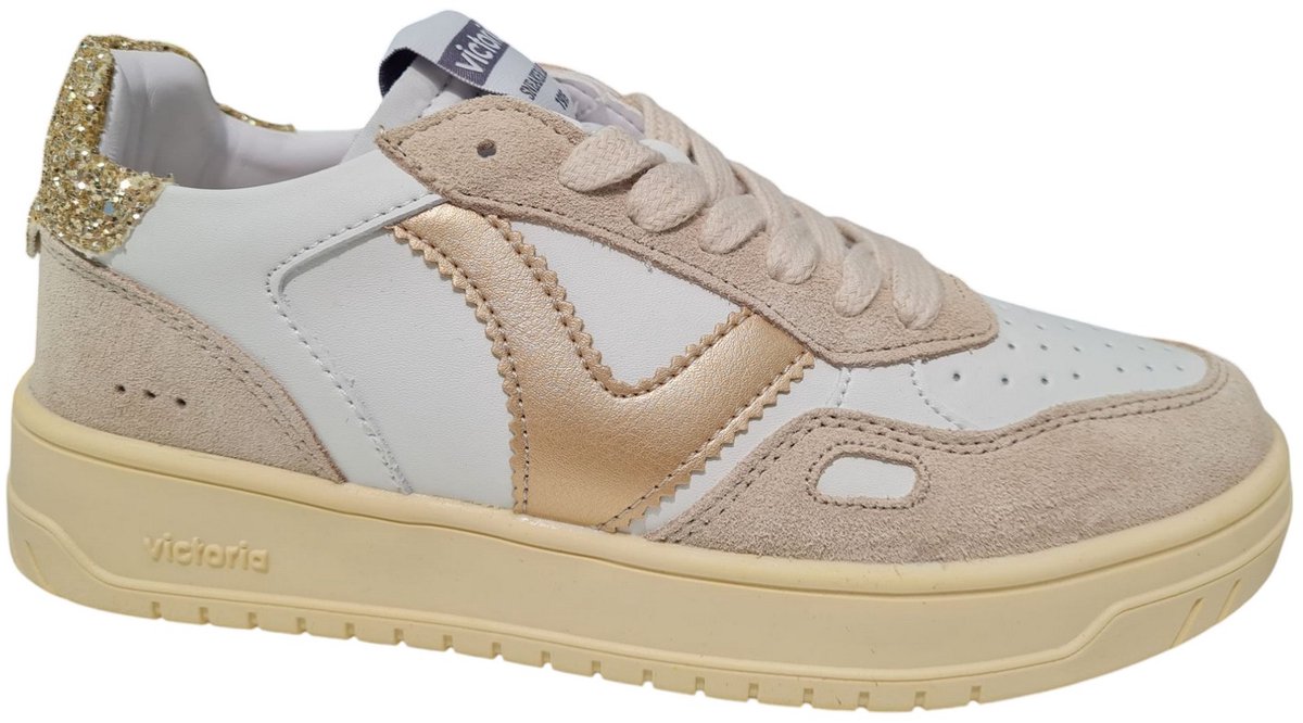 * Kleur: Platina * Bovenwerk: LWG-gecertificeerd rundleer, synthetisch en textiel * Voering: Textiel en synthetisch, met uitneembare binnenzool * Buitenzool: TPR (thermoplastisch rubber) * Hoogte: 3 cm * Details: Sportieve damessneakers met splitleren overlays, structuurglitterdetail op de achterkant, metallic V aan de zijkant en vensterdetail. 3,5 cm licht geroosterde tong. Extra gevoerde binnenzool voor meer comfort * Gebruik: Ideaal voor een sportieve en casual look, perfect voor het compleet maken van vrouwelijke outfits met een moderne en vrolijke touch
