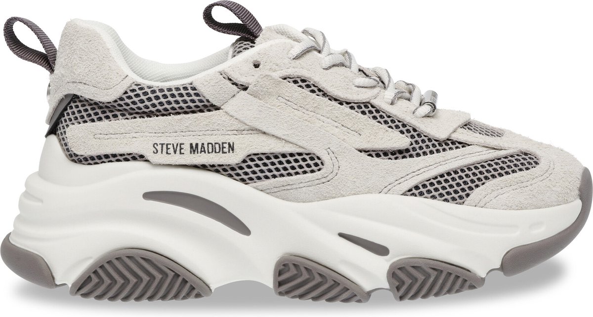 Creatief en speels: dat zijn de sneakers van de Amerikaanse ontwerper Steve Madden. Zo ook dit gave model POSSESSION! Dit model is uitgevoerd in grijs mesh met suède overlays de kleur beige met toffe grijze accenten. Leuke details zijn de dubbele stiksels, de zwarte merkopdruk op de zijkant, de zilverkleurige merkstud op de hiel en het merkembleem op de veters. Het binnenwerk is gemaakt van mesh en heeft een uitneembaar voetbe... lees meer over dit product