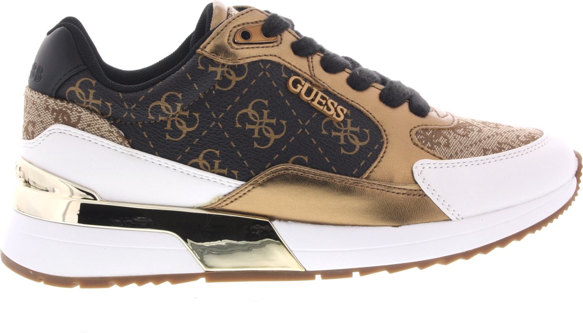 Guess sneaker voor dames, artikel Moxea in het bruin leatherlook. Pluspunt is het lichte gewicht van de schoen. De pasvorm valt normaal. lees meer over dit product