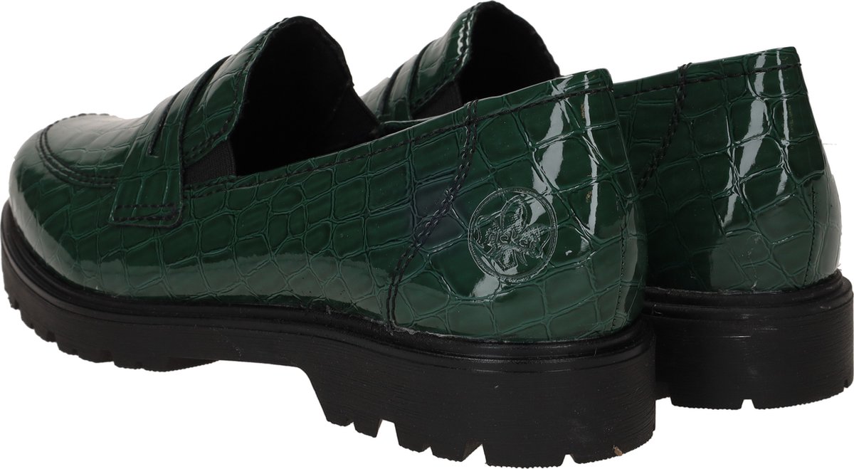 Stijlvolle lakgroene Rieker instapper. De instapper heeft een mooie dierenprint. Deze schoen heeft een voetbed gemaakt van leer. De loafer heeft een stevige zool. De loafers zijn daarnaast ook nog voorzien van een verharde hiel. Dit zorgt voor extra stevigheid tijdens het lopen! lees meer over dit product