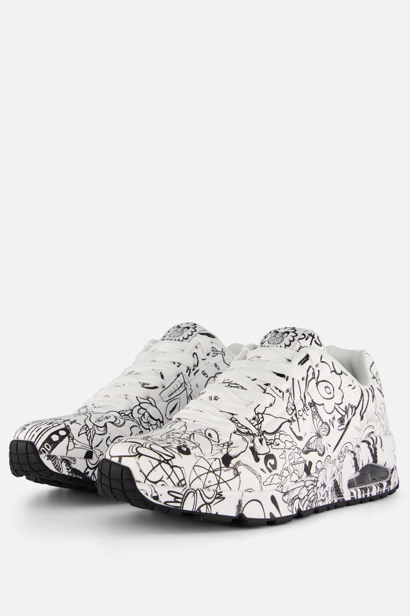 Deze Skechers Uno-Process Sketch sneakers hebben een bovenwerk van synthetisch durabuck. Geïnspireerd door de ruwe schetsen van de Belgische kunstenaar Vexx. De voering en comfortabele binnenzool met air-cooled memory foam zijn van textiel. De zool heeft een zichtbare Skech-Air tussenzool en is gemaakt van rubber met een hak van 3,8 centimeter.¶ lees meer over dit product