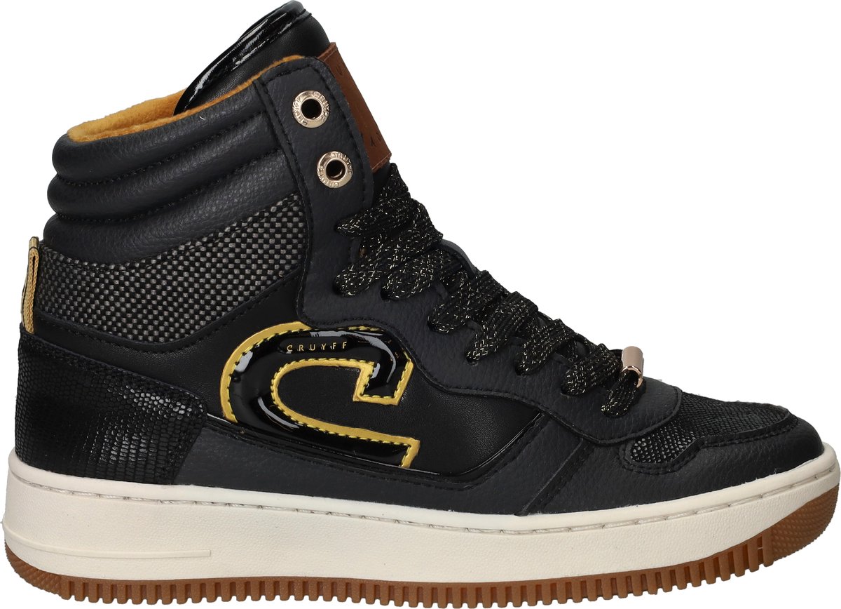 Gave Cruyff Campo High sneaker voor meiden. De zwarte sneaker is gevoerd met fluweelzacht textiel en heeft een veter- en ritssluiting voor een makkelijke instap.