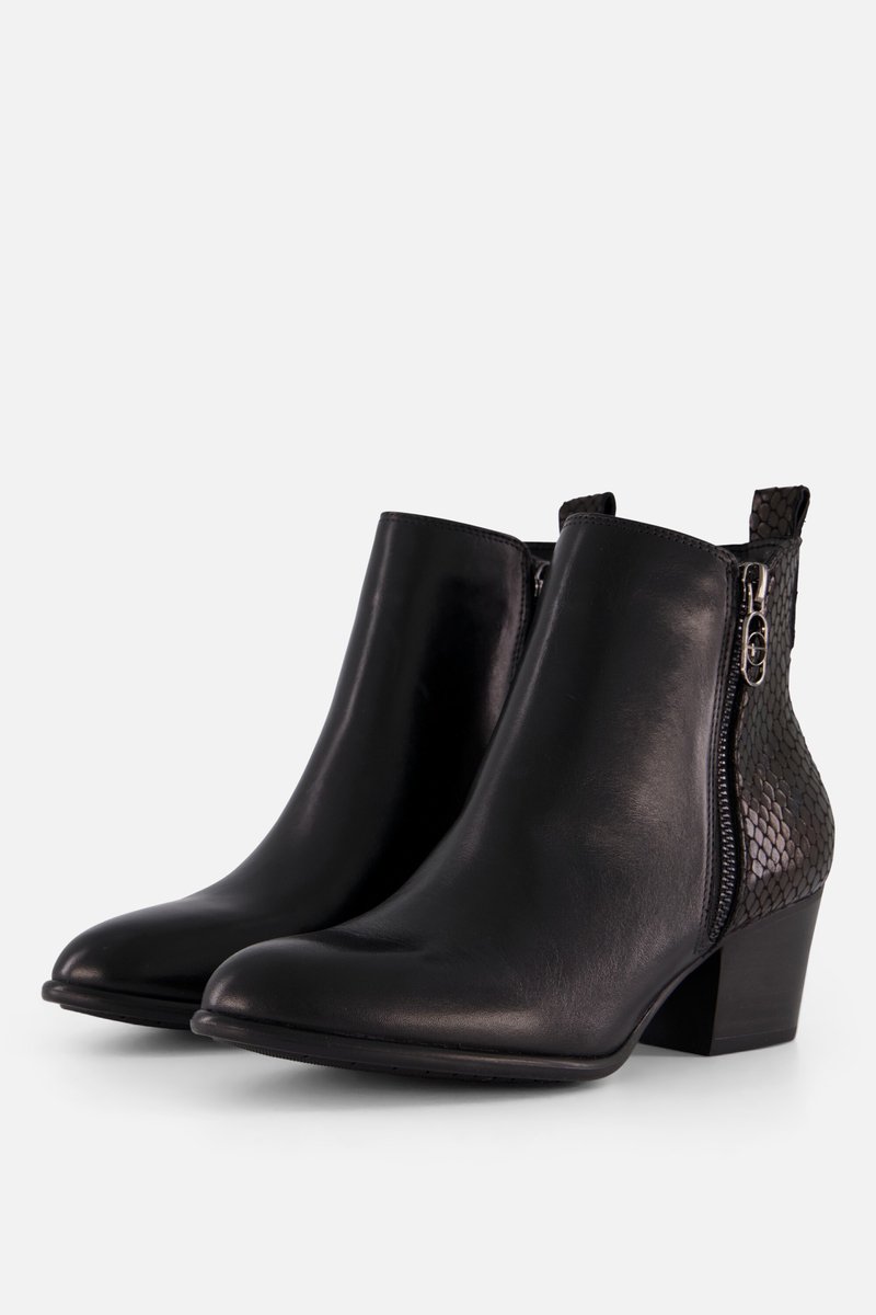 Deze Tamaris enkellaarsjes in de kleur zwart zijn gemaakt van leer. De voering en comfortabele binnenzool zijn van textiel. De hak is voorzien van een elegante slangenprint. De zool is gemaakt van rubber en heeft een dikte van 5 centimeter. lees meer over dit product