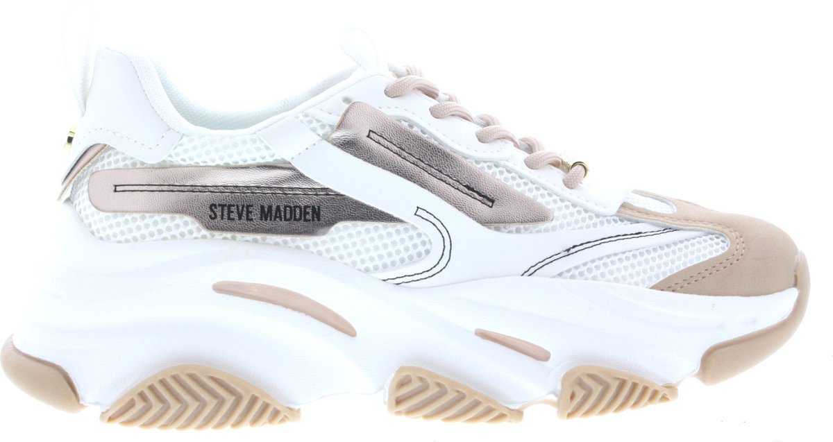 De Steve Madden Possession-E dames sneaker is de perfecte mix van luxe en sportieve flair. Het bovenwerk is uitgevoerd in een opvallende rose metallic leatherlook, die een glamoureuze, moderne uitstraling biedt. De witte accenten geven de sneaker een frisse, cleane look die moeiteloos combineert met elke outfit.Deze sneaker is niet alleen een eyecatcher, maar biedt ook ultiem comfort. De lichte constructie en dempende zolen zorgen voor een zachte stap, waardoor je de hele dag door kunt genieten van een comfortabele pasvorm. Of je nu een casual look wilt creëren of je outfit een trendy upgrade wilt geven, de Possession-E is de perfecte keuze.Kenmerken:Kleur: Rose metallic leatherlook en witMerk: Steve MaddenStijl: Trendy en sportief met een luxe uitstralingMateriaal: Rose metallic leatherlook voor een chique effectComfort: Lichte, dempende zolen voor optimaal comfortMet de Possession-E kies je voor een statement sneaker die zowel stijlvol als comfortabel is, en die je outfit een moderne, glamoureuze twist geeft!.