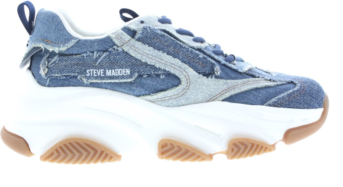 Creatief en speels: dat zijn de sneakers van de Amerikaanse ontwerper Steve Madden. Zo ook dit gave model POSSESSION! Dit model is uitgevoerd in blauw denim textiel, de verschillende gekleurde denim overlays, zorgen voor een stoere uitstraling. De leuke details zijn de dubbele stiksels, het merkopdruk op de zijkant, metalen merkembleem bij de veters en de merkstud op de hiel. Het binnenwerk is gemaakt van wit mesh en heeft een uitneembaar voetbed met fijne demping. De tong en enkelkraag zijn opgevuld voor extra comfort en op de tong en hiel vind je handige aantreklusjes. Het grove profiel van de zool creëert veel grip bij iedere stap. De zool zorgt niet alleen voor comfort, maar ziet er ook superleuk uit met zijn bruine loopzool golvende vormen. Een sneaker om verliefd op te worden! Heb jij al een crush?