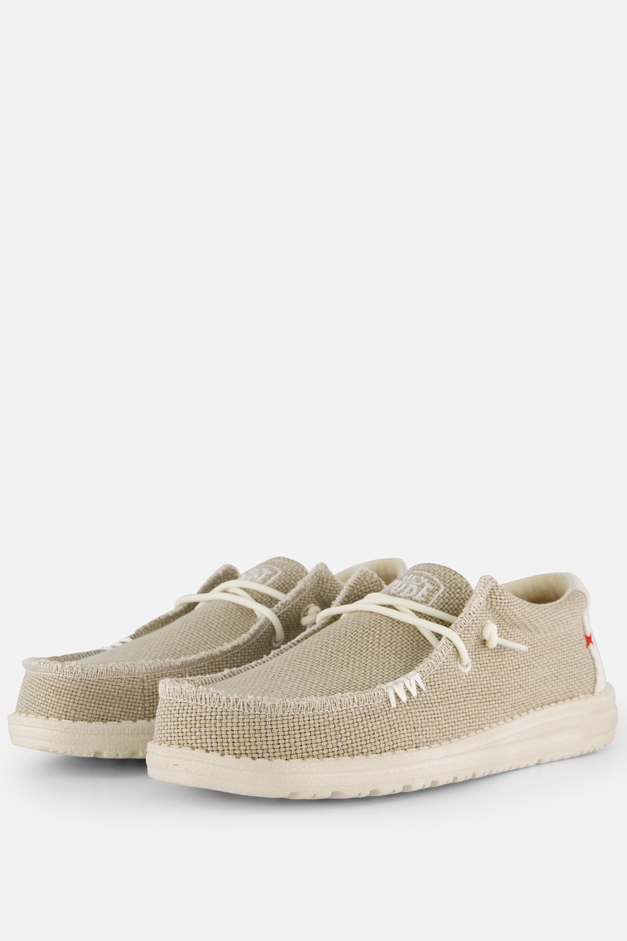 Deze Hey Dude Braided instappers voor heren hebben een relaxed loafer model met een casual uitstraling. Het beige canvas bovenwerk zorgt voor een rustige en veelzijdige look die makkelijk te combineren is. De veters geven de instappers een speelse en nonchalante twist en zorgen voor een goede pasvorm. Dankzij het lichte design zijn deze instappers ideaal voor dagelijks gebruik, of je nu een dagje op pad gaat of gewoon comfortabel voor de dag wilt komen.