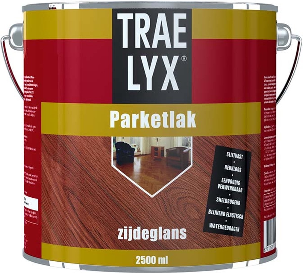 Trae-Lyx Parketlak Mat. een waterverdunbare, glasheldere 1-componentenlak met een zeer hoge slijtvastheid. Door de bijzondere slijt- en stootvastheid uitzonderlijk geschikt voor de verzegeling van parket- en andere houten vloeren, trappen, deuren, betimmeringen, etc. Door de unieke samenstelling verandert de kleur van het hout nagenoeg nie.