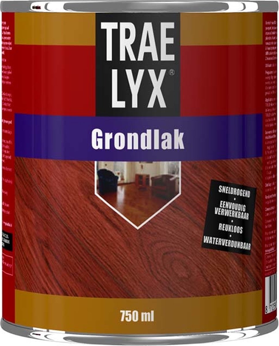 Trae-Lyx Grondlak. Een watergedragen ééncomponent blanke parketprimer met een vernieuwde kwaliteit. Speciaal ontwikkeld voor het isoleren van houten vloeren. Voorkomt verkleuringen en doorslag van noesten en kwasten in de daarna aan te brengen laag lak. .