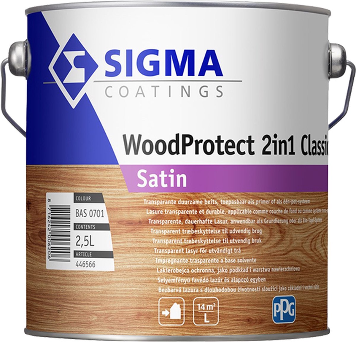 Sigma Woodprotect 2 in 1 Classic, is een oplosmiddelhoudende, thixotrope, transparante impregneerbeits voor buiten. Geschikt als eerste laag in transparante beitssystemen op kozijnen, ramen en deuren. Daarnaast Sigma WoodProtect 2in1 Classic Satin ook geschikt voor het impregneren en afwerken van rabatwerk, tuinhout, blokhutten en dergelijke.