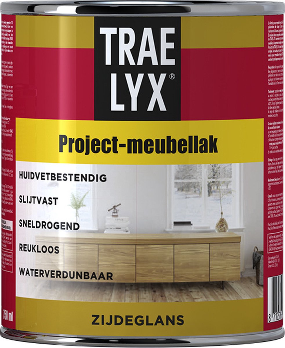 Trae-Lyx Meubellak Satin. Een waterverdunbare, niet vergelende transparante lak op basis van polyurethaan-acrylaat harsen. Vrijwel reukloos. Makkelijk te verwerken en geeft in afgesloten ruimtes geen hinderlijke geur. Bestand tegen vocht, gebruikelijke huishoudreinigingsmiddelen, diverse chemicaliën en drinkalcohol. Niet bestand tegen lang.