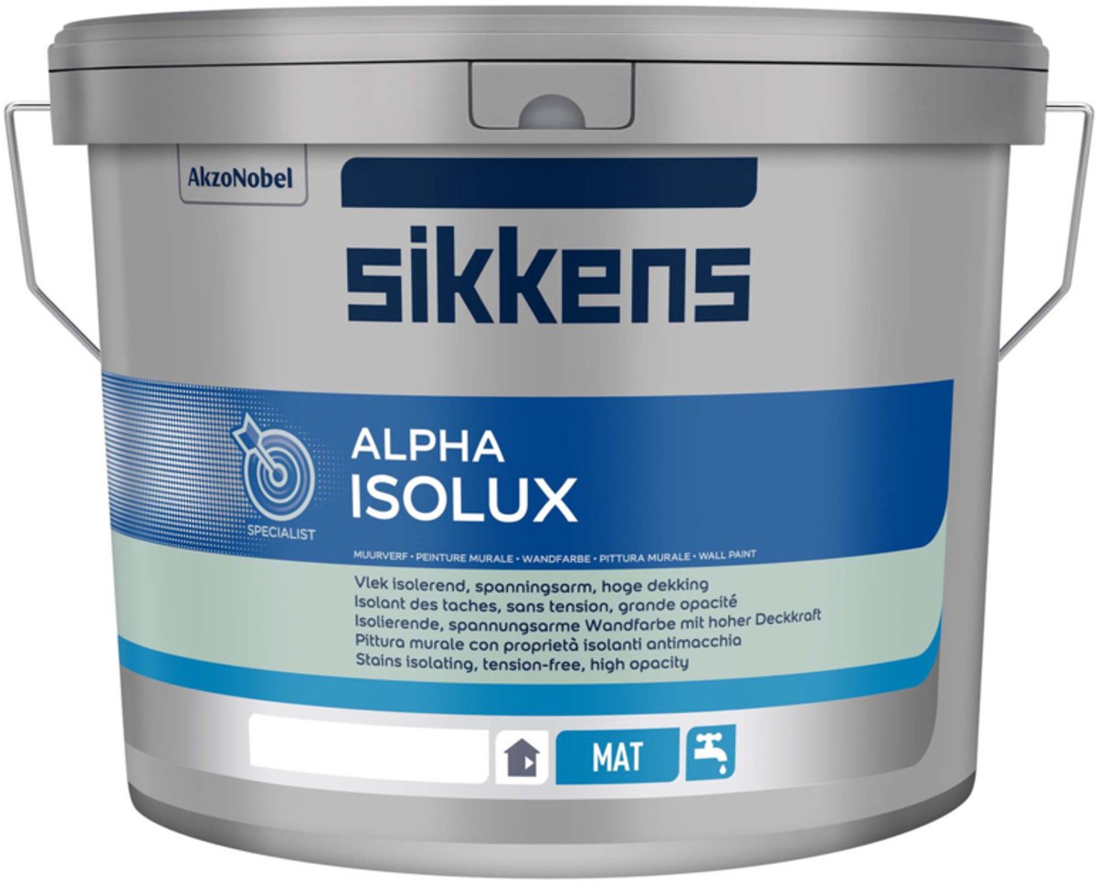Sikkens Alpha Isolux - Isolerende matte muurverf Omschrijving Sikkens Alpha Isolux SF is een isolerende matte muurverf voor binnen ter voorkoming van doorslag van diverse typen vervuiling. Ze is geschikt voor de behandeling van winddroog beton, schuurwerk, pleisterwerk, metselwerk, gips- en boardplaten, houtwolcementplaten, behang e.d. In geval van extreme vervuiling kan een derde laag noodzakelijk zijn om alle doorslag te eli... lees meer over dit product
