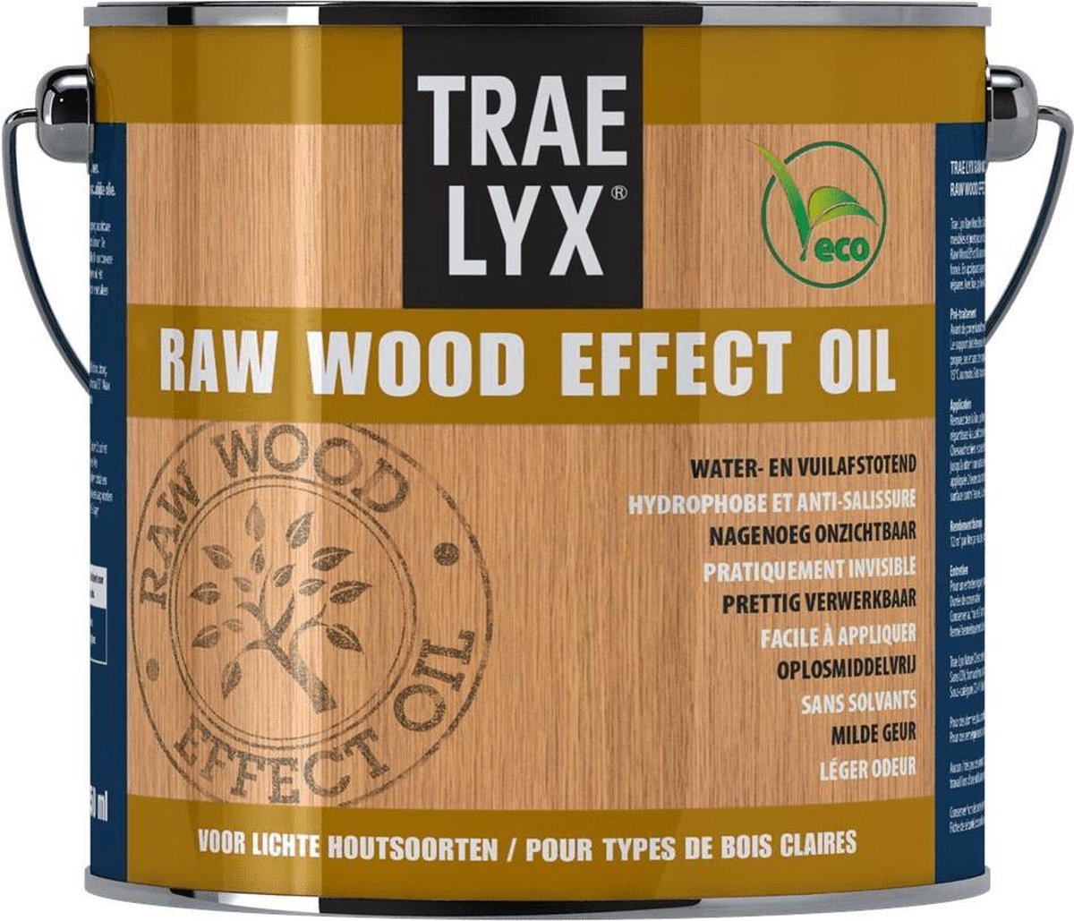 Trae-Lyx Raw Wood Effect Oil geeft de look & feel van onbehandeld hout. Trae-Lyx Raw Wood Effect Oil geeft houten objecten zoals vloeren, parket, trappen, meubels en ook kinderspeelgoed een nagenoeg onzichtbare maar optimale matte bescherming.
