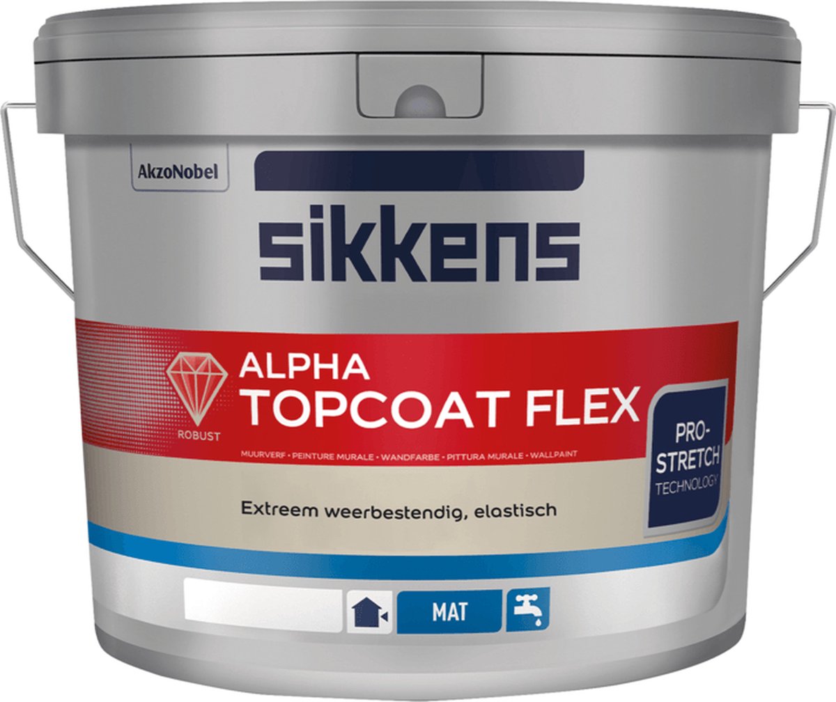 Sikkens Alpha Topcoat Flex - Gevelverf Omschrijving Bij uitstek geschikt voor elastische afwerking op Alphacoat (= zeer elastische kwartsverf). Al dan niet in combinatie met Alphacoat, toepasbaar op winddroog beton, gasbeton, metselwerk, enz... Ook te gebruiken in combinatie met bewapeningsvlies. Belangrijkste eigenschappen Zeer hoge en duurzame elasticiteit Voeg- en haarscheuroverbruggend (ook bij temperaturen onder het vr... lees meer over dit product