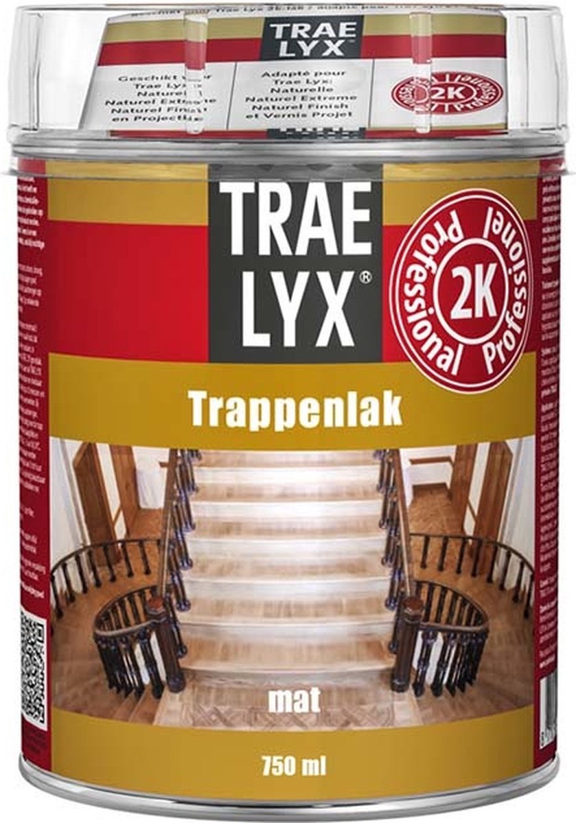 Trae Lyx Trappenlak is een waterverdunbare, 2-componenten polyurethaanlak. De lak is speciaal ontwikkeld om te gebruiken op houten trappen, die zeer intensief belast worden.