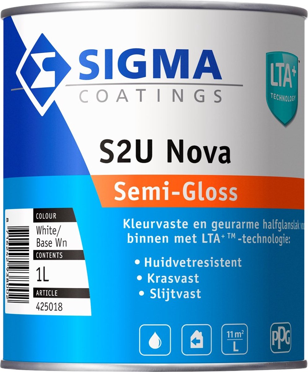 Sigma S2U Nova is een hoogwaardige, halfglanzende lakverf voor binnen. Sigma S2U Nova is geschikt voor het schilderen van bestaande, intacte, geschuurde verflagen, zowel op waterbasis als op terpentinebasis. Door de toegevoegde polyurethaan is deze hoogglans lak kras- en slijtvast. Sigma S2U Nova is goed dekkend en makkelijk te verwerken, heeft een uitstekende vloeiing en een lange open tijd. Daardoor heeft deze lak een egaal aanzien na droging. Wat is LTA+ technologie? Je ziet het regelmatig rond een deurklink: vuile, beschadigde en soms helemaal weggesleten lak. De oorzaak daarvan is huidvetinwerking. Telkens als de deur wordt vastgepakt blijft een beetje huidvet op de verffilm achter. Dit kleine beetje werkt in op de laklaag en wordt hierin opgenomen. Na langdurige belasting verweekt de laklaag en deze wordt zacht en plakkerig. De lak is dan gevoelig voor vuilaanhechting en wordt gemakkelijk beschadigd. De toegepaste LTA+ technologie in deze verf werkt door de speciale bindmiddelcombinaties als een schild. Het beschermt de lak tegen huidvet en dagelijks gebruik. Vet kan nog nauwelijks op de verflaag inwerken. En eventueel binnengedrongen vet hecht zich niet aan de lak. Dankzij de LTA+ technologie blijft de lak ook na langdurige vetbelasting keihard. Waarop kan ik Sigma S2U Nova toepassen? Sigma S2U Nova is een lakverf voor binnen. U kunt de verf gebruiken op hout, staal en non-ferrometalen. Ook voldoet Sigma S2U Nova aan de Europese Speelgoedlijnen EN 71-3*. Hierdoor is het veilig te gebruiken op kinderkamers, kindermeubels en speelgoed. Omdat Sigma S2U Nova ook nog geurarm, huidvetresistent en kras- en slijtvast is, is deze verf een perfecte keuze in uw huis. Hoe kan ik Sigma S2U Nova toepassen? Waarmee kan ik de verf aanbrengen? Sigma S2U Nova kan zowel verdund als onverdund aangebracht worden. U kunt voor het aanbrengen van de verf een kwast of een roller gebruiken. Hoe breng ik Sigma S2U Nova aan? Nieuw hout * Reinig en ontvet de ondergrond met een verfreiniger * Schuur de ondergrond en repareer die (indien nodig) * Gronden met S2U Nova Primer * Lak nu voor en af met Sigma S2U Nova Semi-glosskunststof * grondig reinigen * gronden met Sigma S2U Nova Primer * Lak nu voor en af met Sigma S2U Nova Semi-glossWat zijn de droogtijden? Wanneer je aan de slag gaat met Nova van Sigma, raden we u aan om de tijd goed in de gaten te houden. Deze lakverf is een uur na het aanbrengen van de eerste laag al stofdroog, na 3 uur is het kleefvrij. En het is overschilderbaar na 5 uur. Let bij de droging ook goed op de omstandigheden. Bij lage temperaturen en een hoge luchtvochtigheid droogt de lakverf trager. Uit welke kleuren kan ik kiezen? U kunt elke willekeurige kleur van onze online kleurenwaaier kiezen. De kleuren van de online kleurenwaaier zijn ter indicatie en kunnen afwijken van de werkelijkheid. In verband met de beeldscherminstellingen kan de kleur afwijken. Wij adviseren te allen tijde om een kleurkeuze te maken uit een papieren kleurenwaaier. Deze kunt u bij ons lenen. De verf wordt speciaal gemengd in de kleur die u kiest. Daardoor kan gemengde verf niet geretourneerd worden. Kiest u voor 100% wit? Deze verf is zonder kleurpigmenten en mag dus wel retour. Sigma S2U Nova bestellen? Sigma S2U Nova is dus een krachtige, kras- en slijtvaste lak voor binnen. Bestel deze vóór 17. 30 op onze website en uw bestelling wordt de volgende dag nog geleverd. En bij een bestelling boven de €50,- profiteert u van gratis verzending! Heeft u nog vragen over Sigma S2U Nova? U mag ons altijd bellen op 06 1902 9244 of mail naar info@.