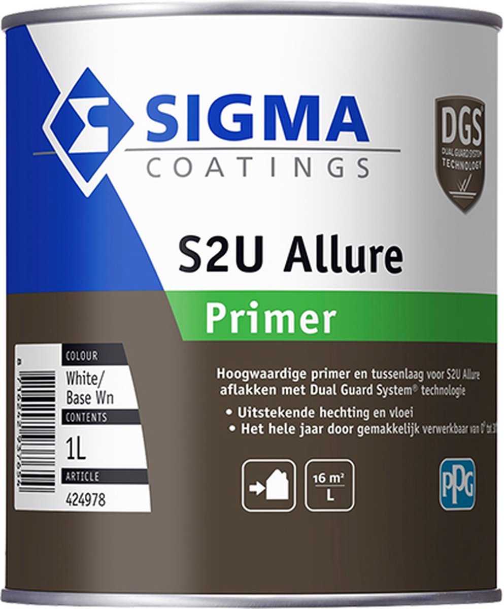 Sigma S2u Allure Primer 1 Liter 100% Wit. Sigma S2U Allure Primer is een primer speciaal voor onder S2U Allure Gloss Deze hoogwaardige primer is een luchtdrogende grondlakverf voor buiten voor het gronden en overgronden van geveltimmerwerk, staal en non-ferrometalen.