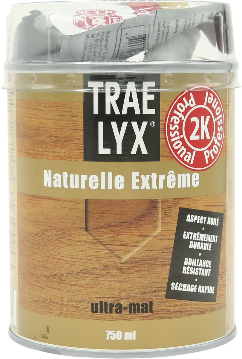 Trae-Lyx Naturel Extreme 2K is een watergedragen, oplosmiddelvrije 2-componenten lak van projectkwaliteit op polyurethaanbasis en geeft hout een ultra matte geoliede uitstraling. Het is uitermate geschikt voor parket, plankenvloeren en meubelen in woonruimten en openbare ruimten, zoals b.v. winkels en restaurants, die blootstaan aan een zeer intensieve belasting. De lak is reukarm, soepel te verwerken, zeer strak vloeiend en snel drogend. Bovendien is Trae-Lyx Naturel Extreme 2K ook geschikt voor donkere houtsoorten. Bij hele donkere ondergronden zoals ebben, wengé en zwart, adviseren wij eerst een laag hoogglans projectlak 2K aan te brengen om een witte waas te voorkomen. Verwerkingstijd is 2 – 3 uur bij 20 graden Celsius Een slijtvast laksysteem bestaat uit minimaal 3 volle lagen van elk 10 – 12 m²/l.