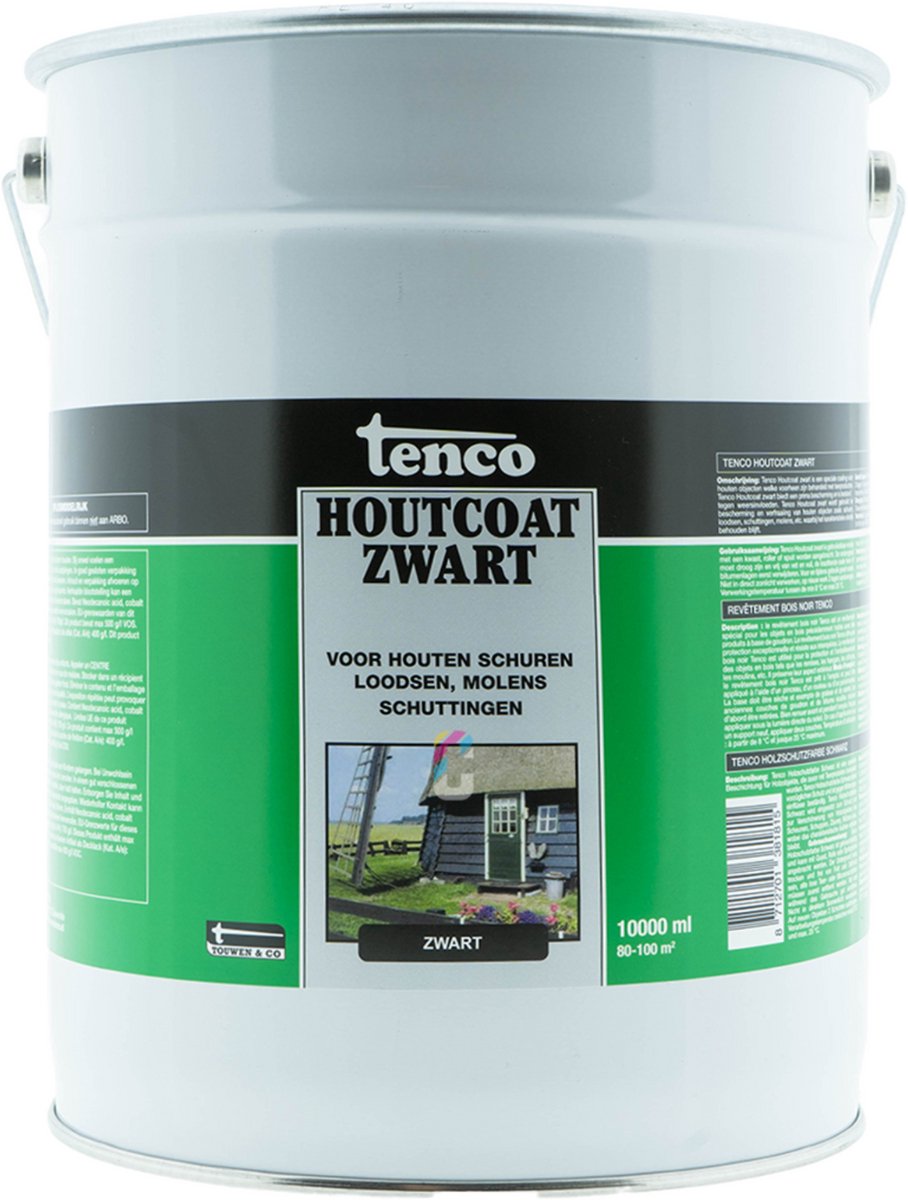 Tenco Houtcoat Zwart (10 liter) is een speciale zwarte coating voor houten objecten. Wordt gebruikt ter bescherming en verfraaiing van objecten zoals schuren, schuttingen, loodsen, molens enz., waarbij het karakteristieke uiterlijk behouden blijft. Biedt een prima bescherming en is bestand tegen alle weersinvloeden.