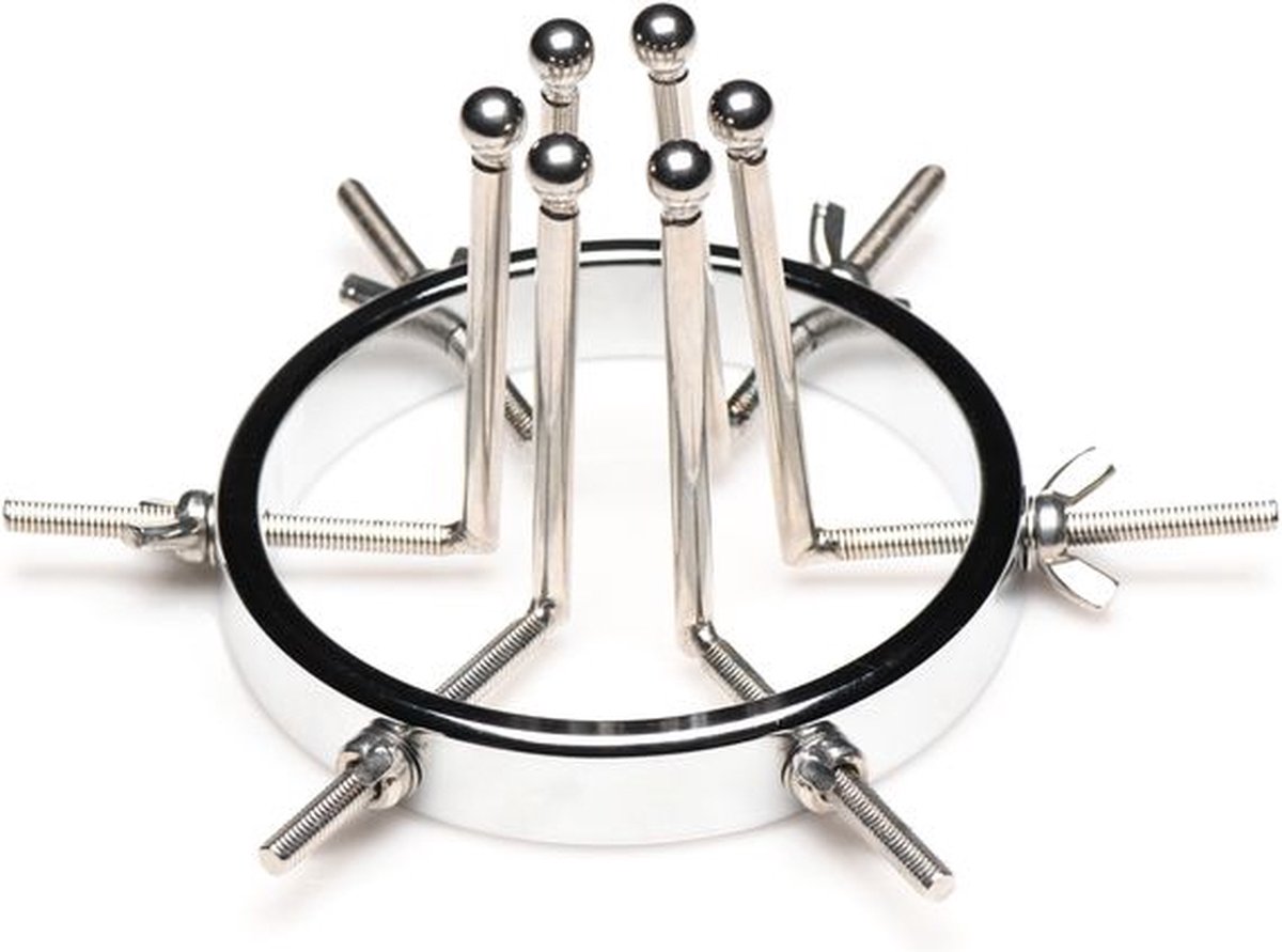 Gemaakt van sterk, duurzaam, nikkelvrij, en roestvrij staal is deze bijzondere anaal plug bruikbaar met alle soorten glijmiddelen. De plug bestaat uit één grote ring met een diameter die verstelbaar is van 2,5 tot maar liefst 10 centimeter. De 6 gladde staven hebben kleine ronde balletjes aan het uiteinde zodat hij comfortabel aanvoelt tijdens het gebruik. Als hij volledig is uitgerekt is hij zelfs groot genoeg om je vuist er door te steken. Elke dilator kan individueel vaster gedraaid worden of losser gemaakt door gebruik te maken van de vleugelmoeren. Reinig na gebruik met lauwwarm water en een toycleaner.