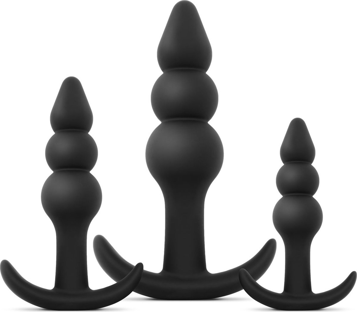Ben je nieuw in anaal spel en op zoek naar een trainingskit, of wil je je collectie uitbreiden? Deze Butt Plug Trio biedt de perfecte variëteit in grootte. Met drie plugs, variërend van klein tot groot, is deze set gemaakt van glad siliconen en heeft een kralendesign voor extra stimulatie. Begin met de kleinste plug en werk geleidelijk naar boven.