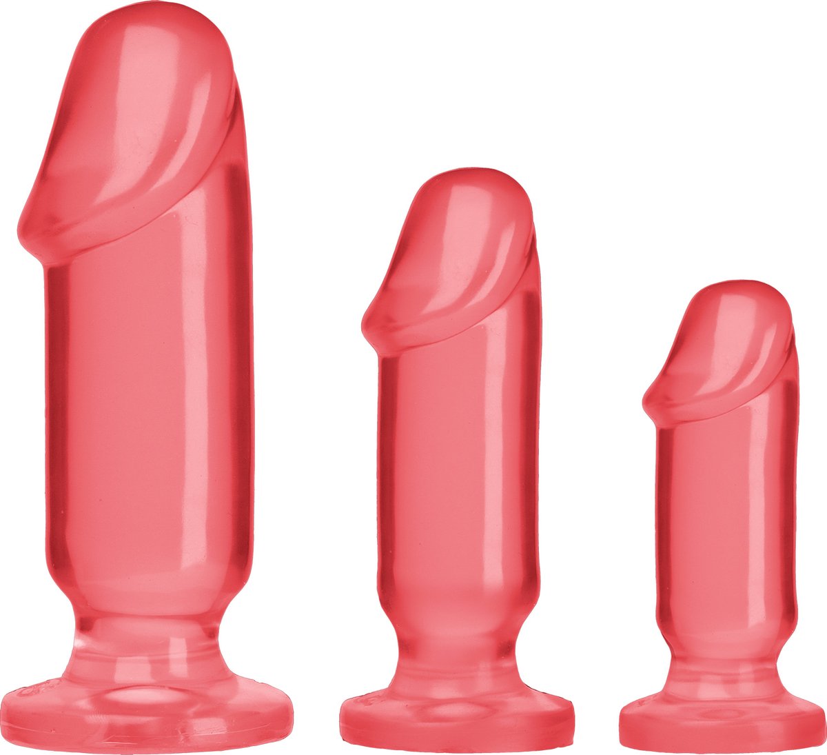 Starter anaal kit, ideaal voor beginners van anale seks! Deze kit bevat drie buttplugs in verschillende formaten (S, M, L),begin met de kleinste en eindig bij de grootste! De buttplugs zijn transparant en lijken op een penis. Ze hebben een zuignap aan de onderzijde waarmee ze op gladde oppervlakten of met strap-ons te gebruiken zijn.
