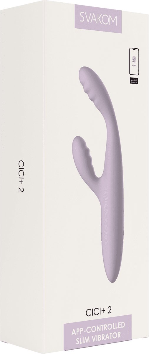 SVAKOM - Cici 2+ - Slanke G-Spot rabbit vibrator (met App-bediening) - Lila Svakom Cici Plus 2 is een slanke en flexibele rabbit vibrator.De super buigbare kop zal gemakkelijk de g-spot bereiken, het maakt niet uit in welke hoek je de stimulatie verkiest, Cici zal er komen, plus het geribbelde ontwerp aan de uiteinden zal de stimulatie verhogen. De kop en clitorisstimulator kunnen onafhankelijk van elkaar of tegelijkertijd wor... lees meer over dit product