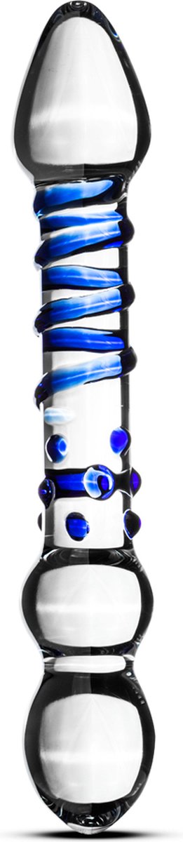 De EasyToys Glazen Dildo is een luxe dildo gemaakt van doorzichtig glas met diepblauwe details. De dildo heeft aan beide kanten een taps toelopende top en kan vaginaal en anaal gebruikt worden. Beide kanten kunnen gebruikt worden voor penetratie en zijn voorzien van een geribbelde en genopte structuur voor extra sensatie. Glazen sextoys zijn veilig te gebruiken in combinatie met alle glijmiddelen en condooms. Daarnaast kun je deze glazen dildo verwarmen of verkoelen door hem onder de warme of koude kraan te houden.