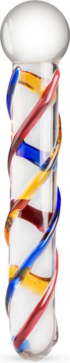 Vul je speeltjescollectie aan met deze prachtige glazen dildo uit het assortiment van Gildo. Deze mooie dildo is gemaakt van transparant glas en is versierd met gekleurde strepen die rond de schacht lopen. Deze strepen geven tegelijkertijd textuur aan de dildo voor extra stimulatie bij elke stoot. Dankzij het niet-poreuze materiaal kun je deze dildo combineren met alle soorten glijmiddel en is hij zeer eenvoudig hygiënisch schoon te maken met toycleaner of milde zeep en water. Daarnaast is de dildo ook geschikt voor Temperature Play. Leg de dildo voor gebruik in warm of koud water en het glas zal snel de temperatuur van het water overnemen. Hierdoor zul je tijdens het gebruik van extra sensatie kunnen genieten.