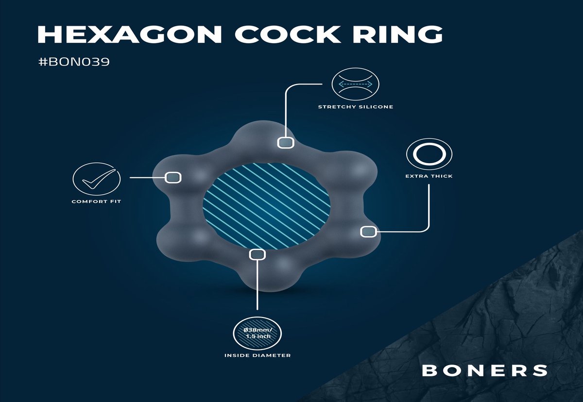 Geniet van hardere, langdurige erecties, intense orgasmes en extra stimulatie met de Hexagon cockring uit de Boners collectie. De ring is gemaakt van zacht siliconen en is voorzien van stalen balletjes aan de binnenkant. De cockring is buigzaam en rekbaar en de balletjes zorgen voor extra stimulatie tijdens het dragen van de ring. Plaats de ring rond de basis van de penis als de penis in slappe toestand is. Tijdens een erectie... lees meer over dit product