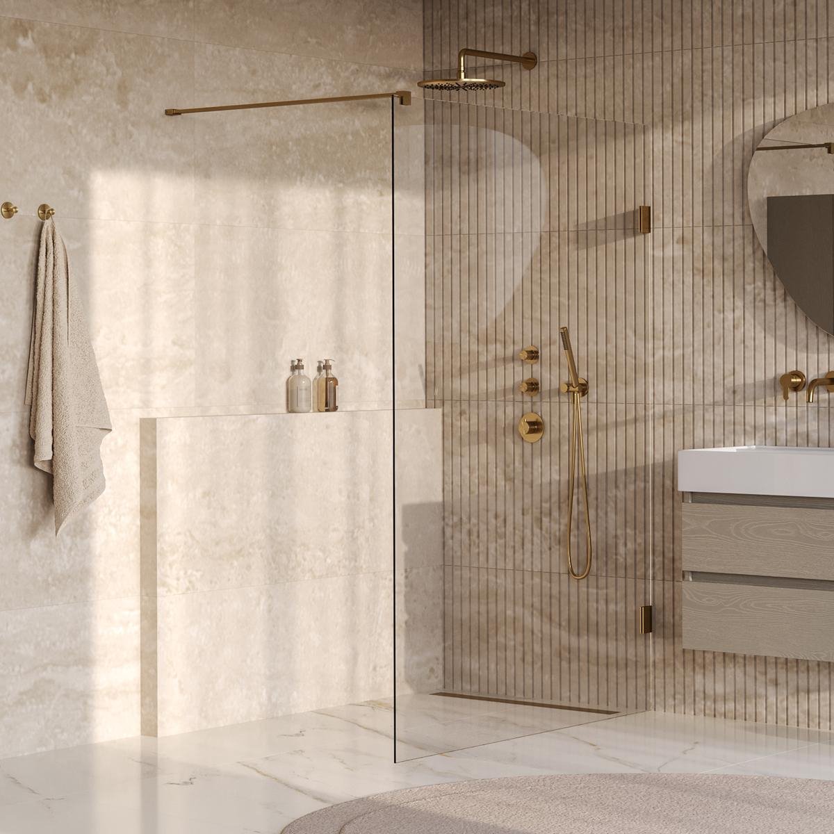 Afmetingen, Zijwand en AfwerkingZonder zijwand blijft een minimalistische, open opstelling behouden met maximale instapvrijheid. Een rechte glaswand zorgt voor spatbescherming in de meest gebruikte richting en houdt de badkamer visueel ruim, terwijl een strak lijnenspel behouden blijft. Een PVD-afwerking in goud geborsteld ondersteunt een duurzame, kleurvaste uitstraling en sluit aan op moderne metaalaccenten. Een solide glasopstelling ondersteunt een nette afwerking langs wand en vloer en helpt de douchezone overzichtelijk te houden. Een combinatie van design en gebruiksgemak die een badkamerproject direct naar een hoger niveau tilt.