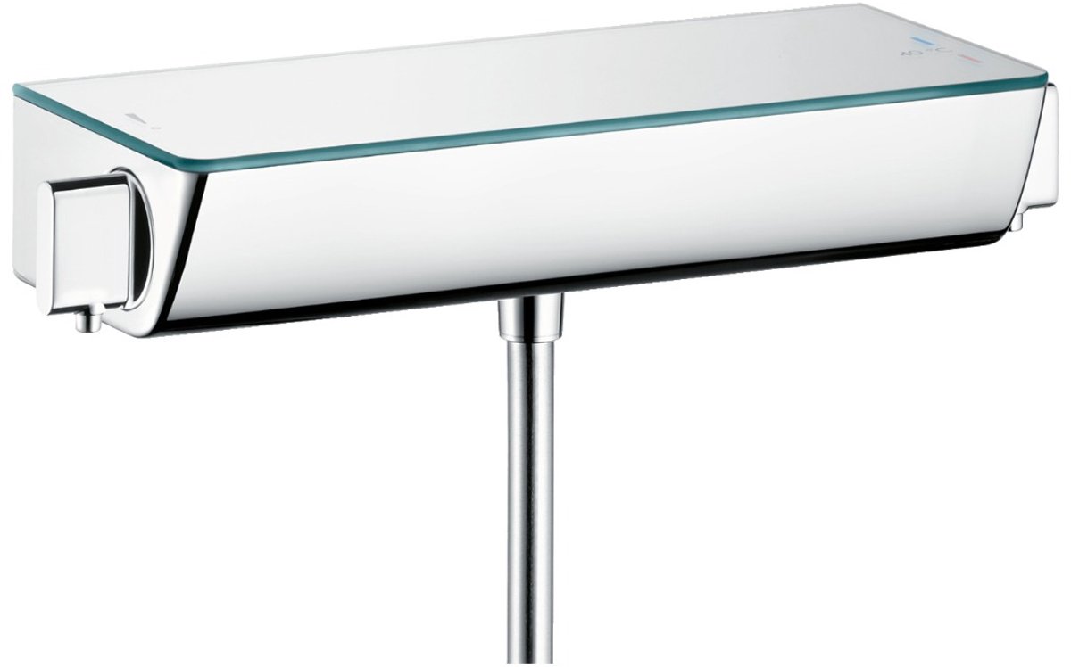 Met de Ecostat Select douchethermostaat wordt de badkamer snel en eenvoudig heel stijlvol. Het moderne, rechtlijnige design en de praktische planchet van gespiegeld veiligheidsglas (breedte 300 mm) voldoen aan de hoogste eisen.