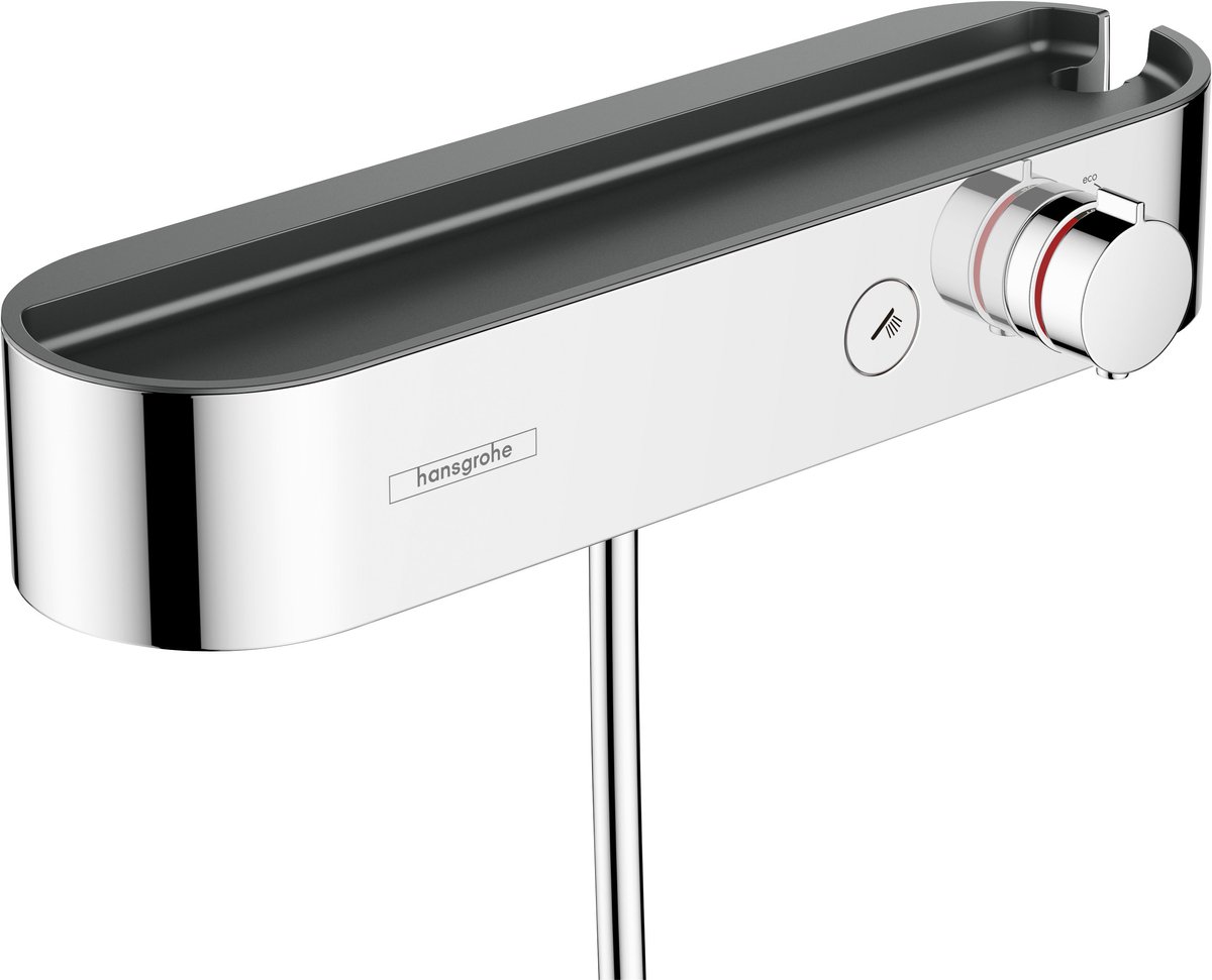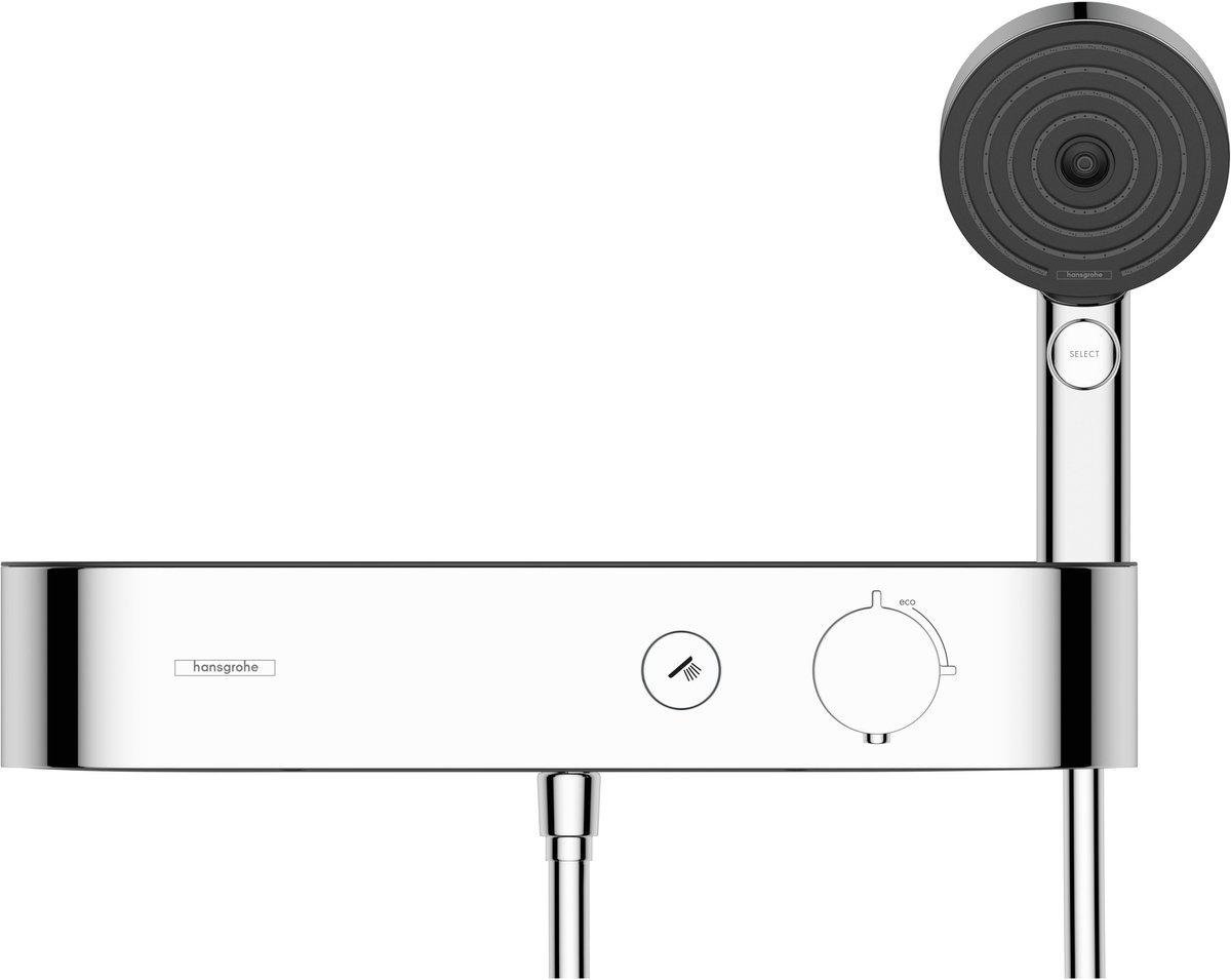 water kan aan- en uitgezet worden door simpelweg op de Select-knop te drukken. De waterhoeveelheid en temperatuur zijn makkelijk te reguleren met de grote draaigreep. Dit zorgt voor moeiteloze bediening en, indien gewenst, een vermindering van de doorstroomhoeveelheid tot wel 30%. De combinatie van chroom en grafietgrijs geeft de thermostaatkraan een frisse uitstraling. De perfecte finish van de bewezen hansgrohe-kwaliteit maakt van de douche nu een stijlvol toevluchtsoord om in te ontspannen. Slimme
