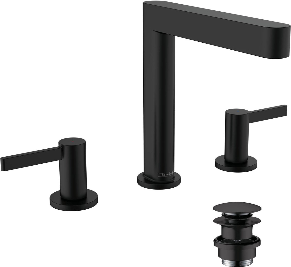 Moderne 3-gats mengkraan in mat zwart voor een puristische badkamersfeer - inclusief PushOpen afvoer De Finoris 3-gats wastafelmengkraan 160 in mat zwart met PushOpen afvoergarnituur van hansgrohe geeft met twee vleugelgrepen een verrassend nieuwe, moderne interpretatie aan het klassieke bedieningsconcept. De slanke, geometrische vormen passen bijzonder goed in de puristische badkamersfeer. De kraan zet een expressief accent d... lees meer over dit product