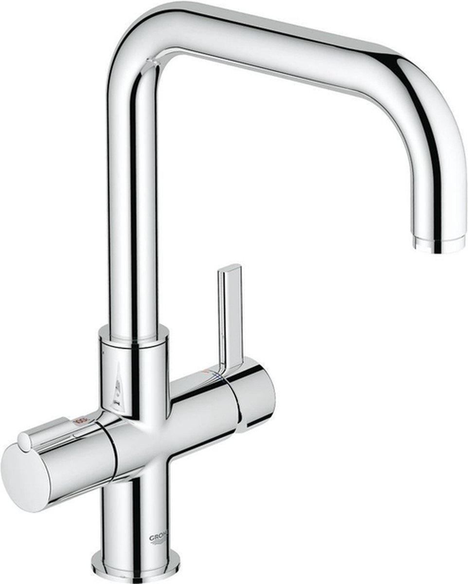 GROHE Red Duo1-greeps keukenkraan, DN 15 aparte bediening voor kokend water gecertificeerde duw- en draaibeveiliging 1-gats montage keramische cartridge met GROHE SilkMove technologie 35 mm GROHE StarLight afwerking draaibare geïsoleerde uitloop aanslagbeperking flexibele aansluitslangen beveiligd tegen terugstroming 2-weg armatuur aansluiting voor GROHE Red Boiler lees meer over dit product