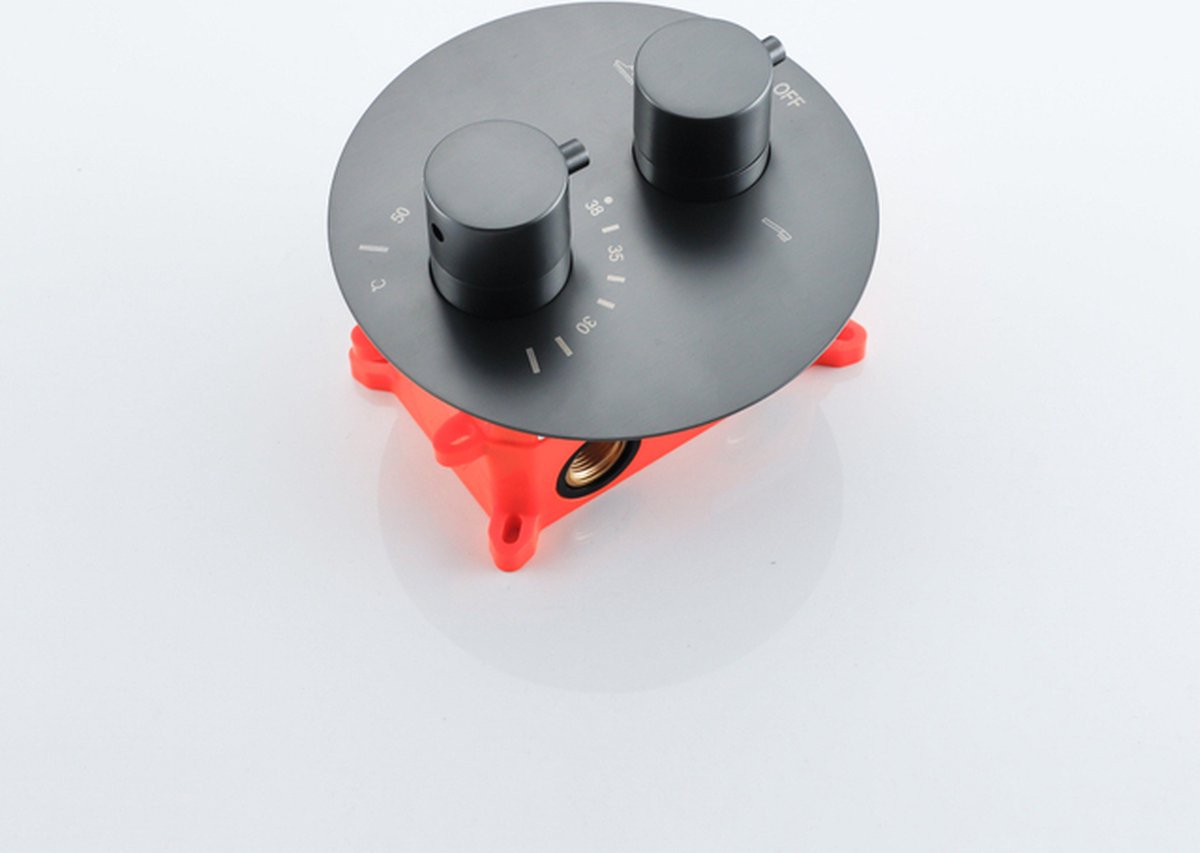 Fortifura Calvi Thermostatische Inbouwkraan - inbouwdeel - rond - Gunmetal De Fortifura Calvi Thermostatische Inbouwkraan in Gunmetal is een prachtige toevoeging aan elke badkamer. Met zijn elegante ronde vorm en moderne gunmetal afwerking, straalt deze inbouwkraan stijl en klasse uit. Niet alleen een lust voor het oog, maar ook van hoogwaardige kwaliteit en functionaliteit. Deze thermostatische inbouwkraan combineert design e... lees meer over dit product