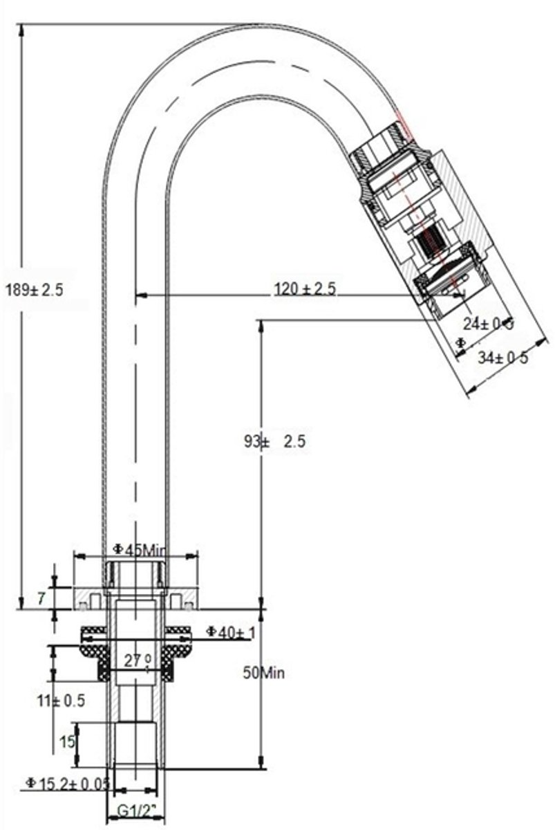 - Opbouwhoogte onderkant kraanmondstuk: 93 mm