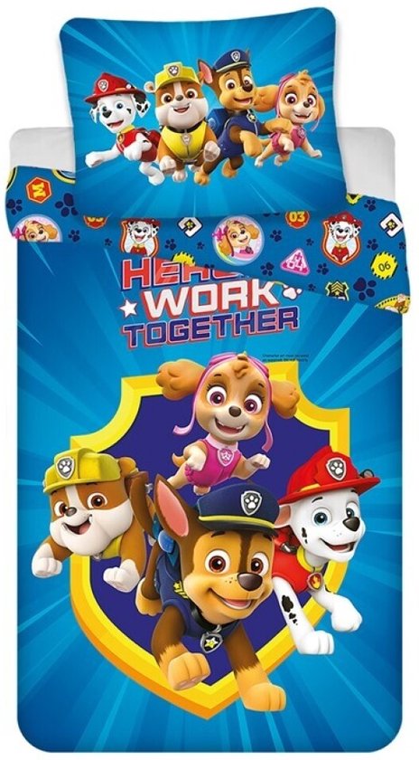PAW Patrol Dekbedovertrek Hero's Work Together 140 x 200 cm - 65 x 65 cm Een leuk katoenen dekbedovertrek van Paw Patrol. Ryder en zijn honden Chase, Marshall en Rocky staan klaar om iedereen in Avonturenbaai te hulp te schieten. Geen probleem is hun te groot! Dit eenpersoons dekbedovertrek is een aanwinst voor elke liefhebber van deze stoere pups. Het dekbedovertrek is dubbelzijdig bedrukt, wat een leuk effect geeft bij het openslaan van het bed. Een geweldig cadeau voor elke Paw Patrol fan en een leuke cadeau suggestie voor een verjaardag of de feestdagen.