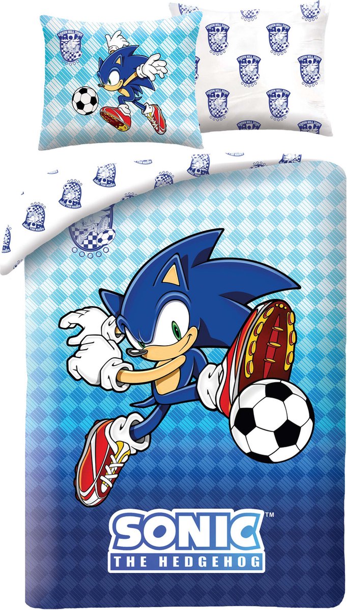 Sonic Dekbedovertrek voetbal 140 x 200 cm. Een cool dekbedovertrek van Sonic the Hedgehog. Deze blauwe egel van de planeet Mobius is gevlucht naar de aarde en probeert nu uit handen van Doctor Robotnik te blijven. Met dit gave polyester dekbedovertrek laat jij zien dat je een liefhebber bent van dit leuke wezentje. Door de dubbelzijdige bedrukking van zowel het overtrek als de kussensloop, kan je ook nog eens afwisselen en heb je dus een echte blikvanger te pakken. Een ideaal cadeau idee voor de fans van Sonic!