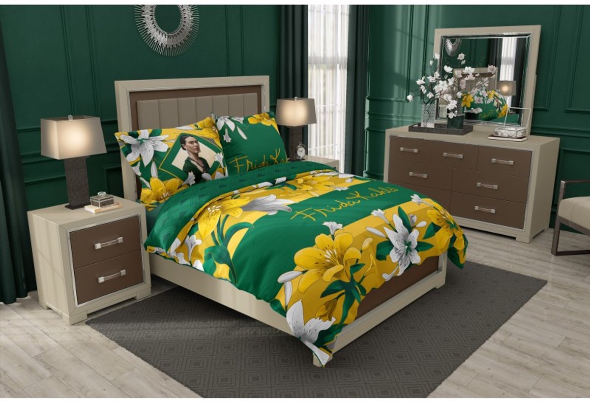 Breng de iconische kunst van Frida Kahlo tot leven met dit stijlvolle dekbedovertrek. Rijkelijk versierd met gele en witte Lelies, geïnspireerd op de bloemen die vaak te zien is in de kunst van Frida Kahlo en welke symbool staan voor zowel kracht als schoonheid. Dit katoenen 1-persoons dekbedovertrek heeft een dubbelzijdige bedrukking en wordt compleet gemaakt door het extra grote kussensloop. Ben je op zoek naar een origineel cadeau voor een fan van Frida Kahlo of een kunstliefhebber? Dan heb je met dit fantastische dekbedovertrek een gegarandeerde hit!