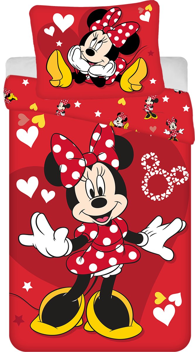 Disney Minnie Mouse Dekbedovertrek, Red Heart. Schatttig, katoenen dekbedovertrek van de altijd stylish-verantwoorde Minnie Mouse. Deze mooie set heeft een afbeelding van Minnie Mouse omgeven door hartjes. De overtrek is dubbelzijdig bedrukt, wat leuke opties geeft bij het opmaken van het bed. Dit zorgt voor een echte blikvanger in de slaapkamer! De set wordt compleet gemaakt door het bijpassende, extra grote, kussensloop. Een waanzinnig leuk cadeau-idee om te geven aan een liefhebber van dit Disney figuurtje voor een verjaardag of de feestdagen.