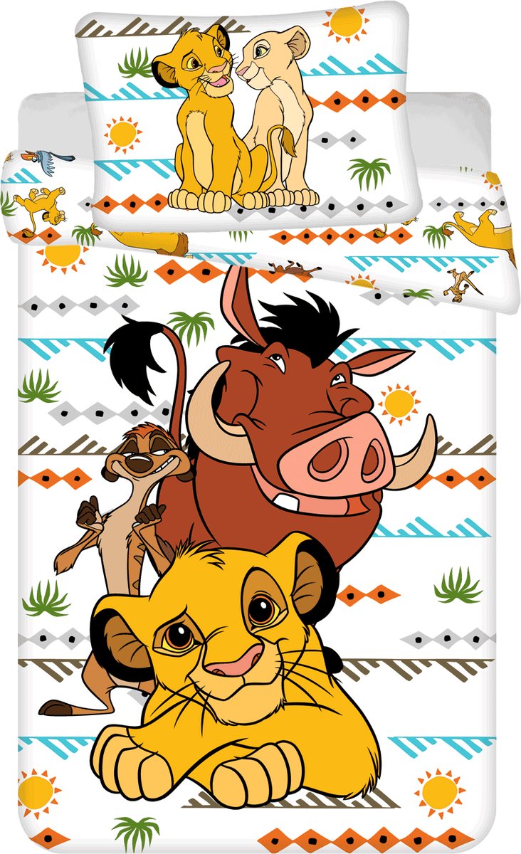 Disney The Lion King Dekbedovertrek Timon en Pumba - 140 x 200 cm Disney The Lion King dekbedovertrek. Leuk kleurrijk polyester eenpersoons dekbedovertrek van The Lion King, met een mooie afbeelding van Simba en Mufasa. Op de achterkant staat een druk van vormpjes en de silhoutten van een aantal personages uit de films. Leuk voor elke fan van The Lion King! Specificaties:EenpersoonsGrootte: 140 x 200 cmKussensloop: 70 x 90 cmM... lees meer over dit product